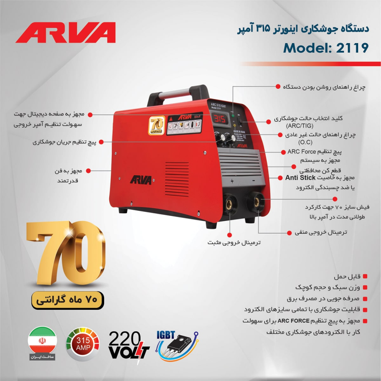 اینورتر جوشکاری مدل ۲۱۱۹ باقدرت ۳۱۵ آمپر دستگاهی با کاربری صنعتی محسوب می‌شود که دارای وزن ۹.۱kg و سایز ۴۷۰x۱۹۰x۳۴۵ می‌باشد. این دستگاه جوش اینورتر نیازهای شما به یک اینورتر جوشکاری با قابلیت مصارف صنعتی را با بالاترین سطح کارایی تامین می‌کند.